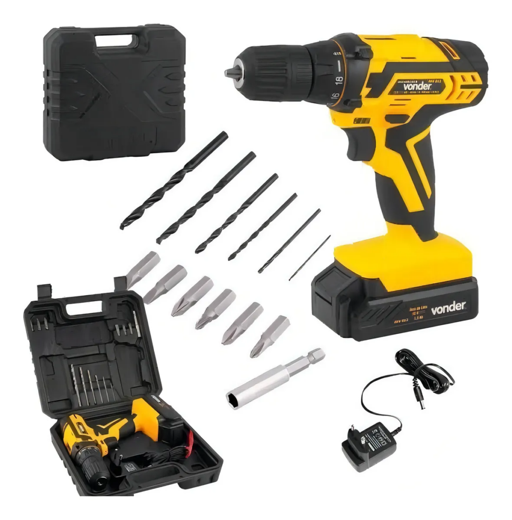 Clássica e versátil, essa parafusadeira de 12V inclui 30 brocas e pontas, bateria de 1,5Ah e maleta. Com torque ajustável em 11 posições e rotação de até 650 RPM, é ótima para gesso e madeira. Avaliações de 2025 a chamam de “a melhor para quem está começando”.