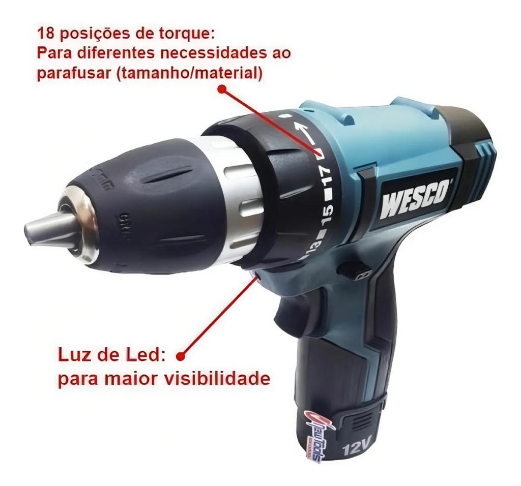 Por que vende tanto? Custo-benefício top, com reviews positivos após anos de uso. Parafusadeira/Furadeira 3/8″ c/ Kit Bits Wesco WS2532 Cor Azul 12V