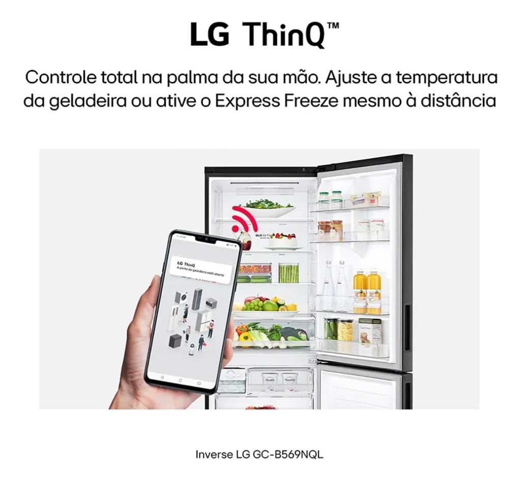 Premium e conectada, a LG GC-B569NQL usa Inverter para economia de até 32% de energia. Com 451L e acabamento black inox, integra-se ao app LG ThinQ para alertas de temperatura.