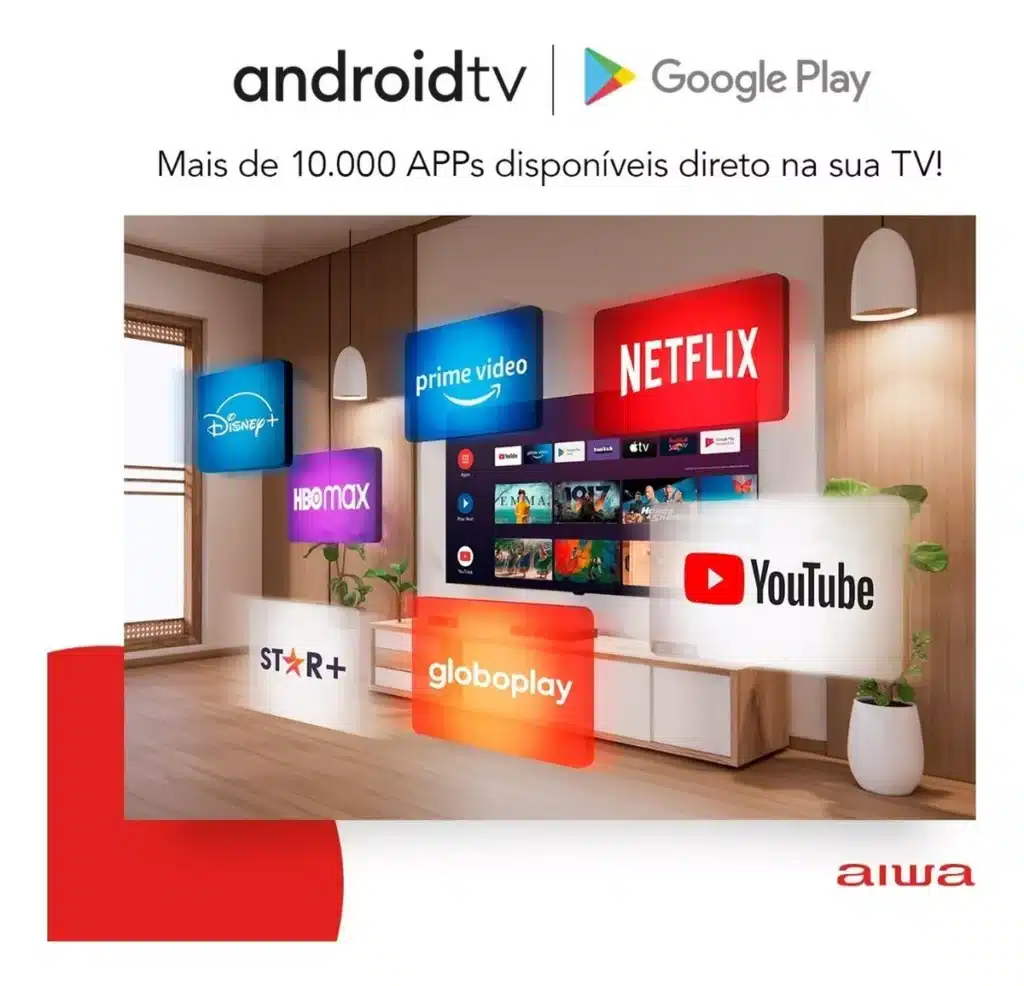 • Com Netflix, Prime Video, YouTube, YouTube Music, Google Play Store, Google Play Games, Google Play Movies & TV.